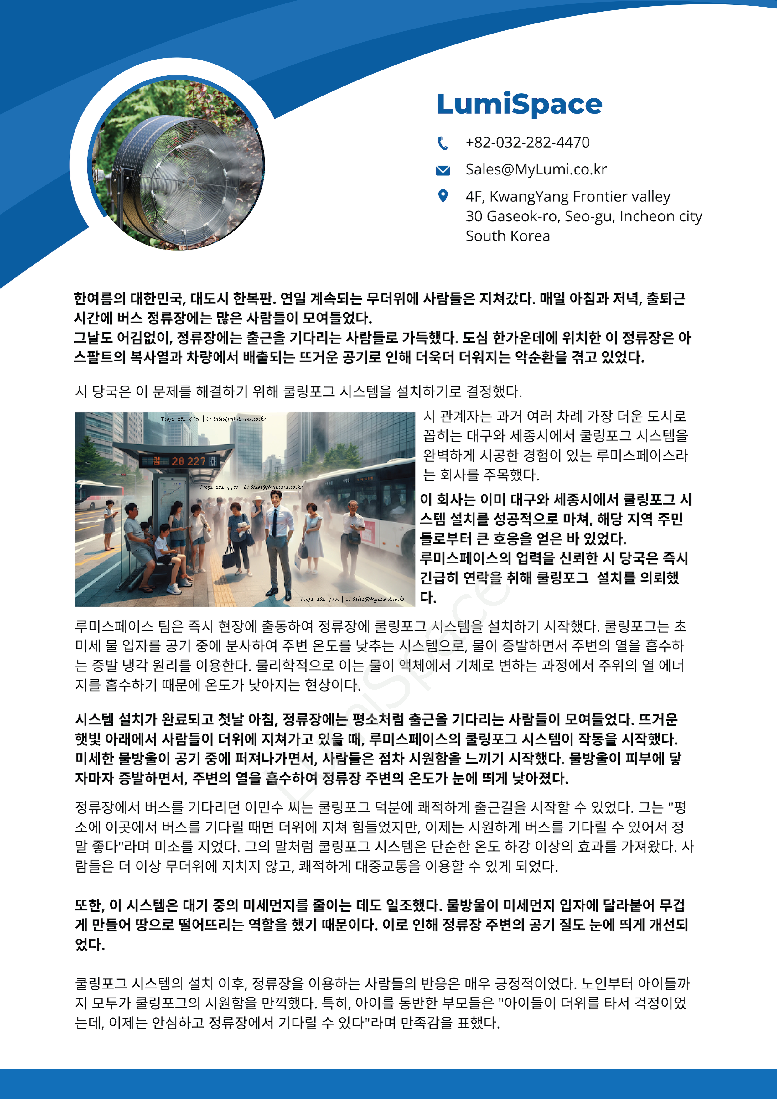 이 회사는 이미 대구와 세종시에서 쿨링포그 시스템 설치를 성공적으로 마쳐, 해당 지역 주민들로부터 큰 호응을 얻은 바 있었다. 루미스페이스의 업력을 신뢰한 시 당국은 즉시 긴급히 연락을 취해 쿨링포그 시스템 설치를 의뢰했다.